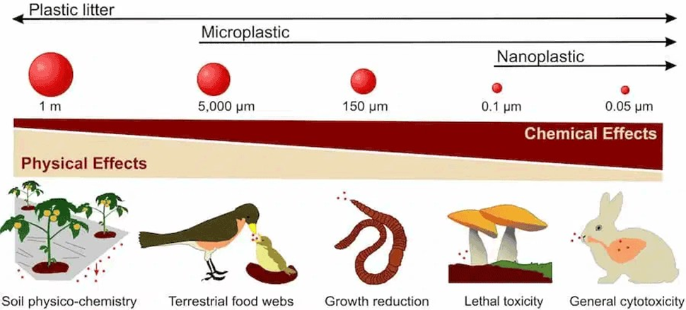 - ผลทางเคมี: ไมโครพลาสติกสามารถพกพาสารพิษ เช่น พลาสติไซเซอร์ สารกันบูด และโลหะหนัก
