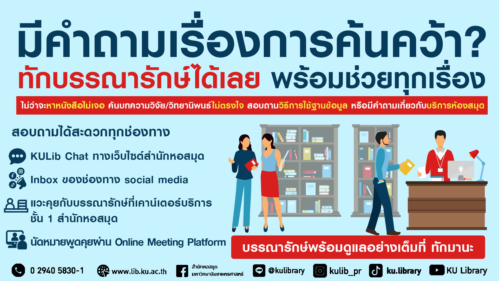 มีคำถามเรื่องการค้นคว้า? ทักบรรณารักษ์ได้เลย พร้อมช่วยทุกเรื่อง