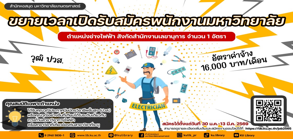 สำนักหอสมุด มหาวิทยาลัยเกษตรศาสตร์ ขยายเวลาเปิดรับสมัครพนักงานมหาวิทยาลัย