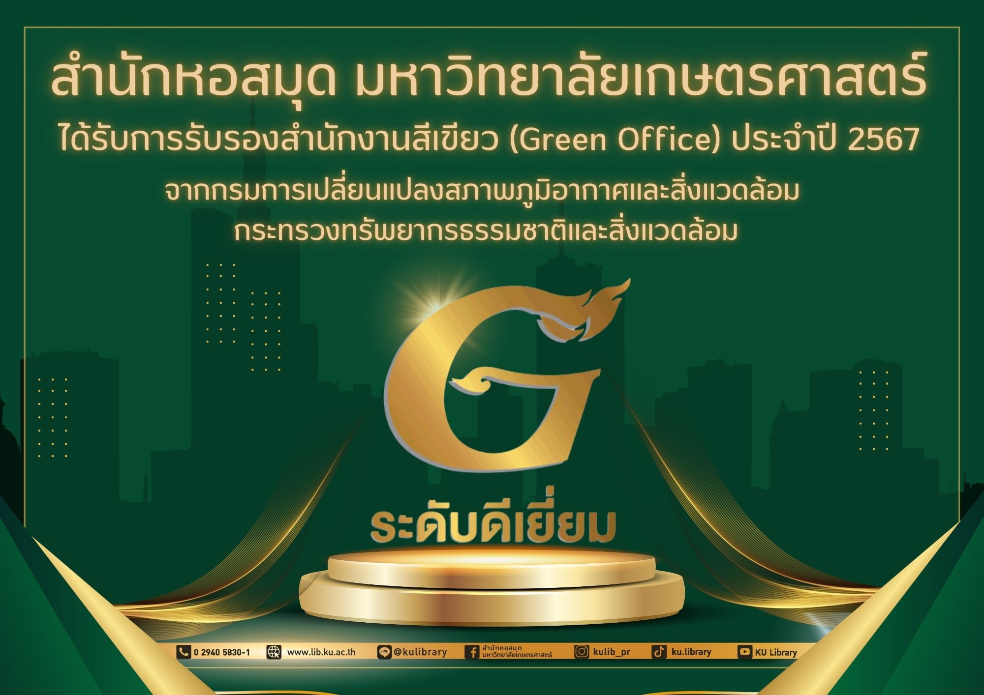 สำนักหอสมุด มหาวิทยาลัยเกษตรศาสตร์ ได้รับการรับรองสำนักงานสีเขียว (Green Office) ระดับประเทศ ตามโครงการส่งเสริมสำนักง...
