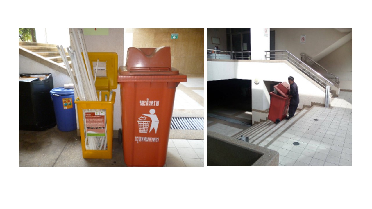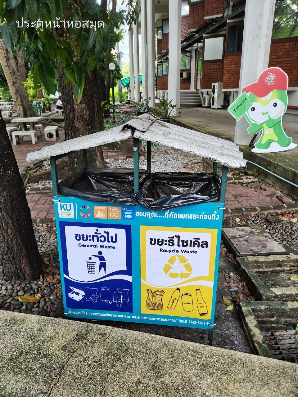 สำนักหอสมุด มหาวิทยาลัยเกษตรศาสตร์กำหนดให้มีถังเพื่อคัดแยกขยะ ทั้งในส่วนของสำนักงาน และส่วนของผู้ใช้บริการ เพื่อสร้างจิตสำนึกในการคัดแยกขยะ และเพื่อช่วยลดปริมาณขยะลง โดยนำเอาขยะในแต่ละวันมาทำการคัดแยกและชั่งเพื่อจดปริมาณ